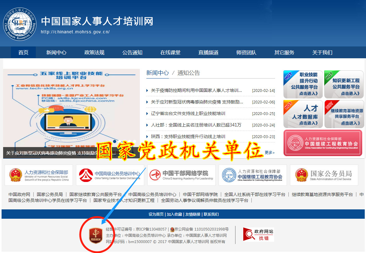 我们通过 中国国家人事人才培训网站底部可以发出,网站为国家政府机关网站,网站尾部为党政机关单位,我们点击“党政机关”图标,进入 全国党政机关事业单位互联网网站标识管理服务平台,通过平台可以看到,中国人事人才培训网为人力资源与社会保障部直属国家培训网站。